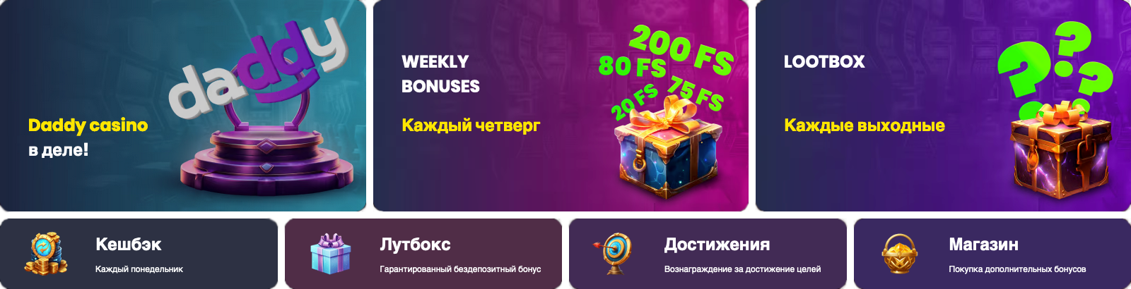Играйте с выводом денег в Daddy казино. На площадке размещены сотни прибыльных автоматов, которые ежедневно выплачивают крупные выигрыши.